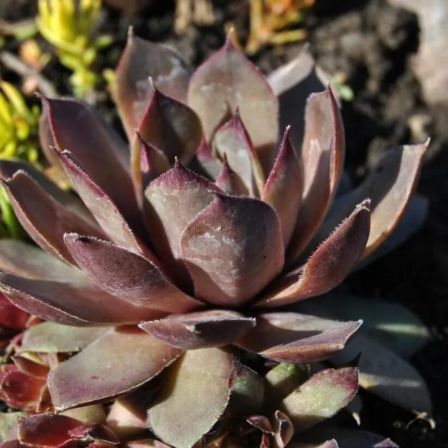 Молодило Rubra Ash - травянистый почвопокровный многолетник. Розетки крупные, пурпурные, с серебристо-зеленым налетом. Листья очень длинные. Кончики заостренные, насыщенно-пурпурные.