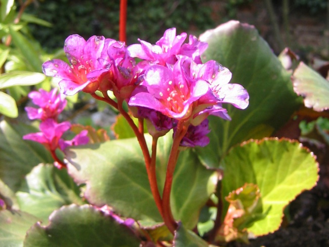 Бадан Abendglut - многолетнее травянистое растение, относится к семейству камнеломковых. Высота - 30-50 сантиметров, жизненный цикл – до трех лет. Листья темно-зеленые, крупные, жесткие, собраны в розетку, форма – округлая.
