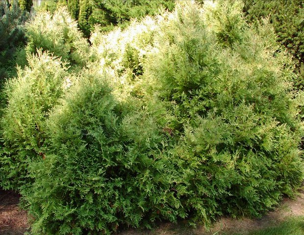 Туя западная Recurva Nana - карликовый кустарник до 2 м высоты и такого же диаметра. Крона шаровидная. Ветви прямые и восходящие. Веточки скрученные. Хвоя чешуйчатая, густая, матово зеленая, зимой буровато-зеленая.
